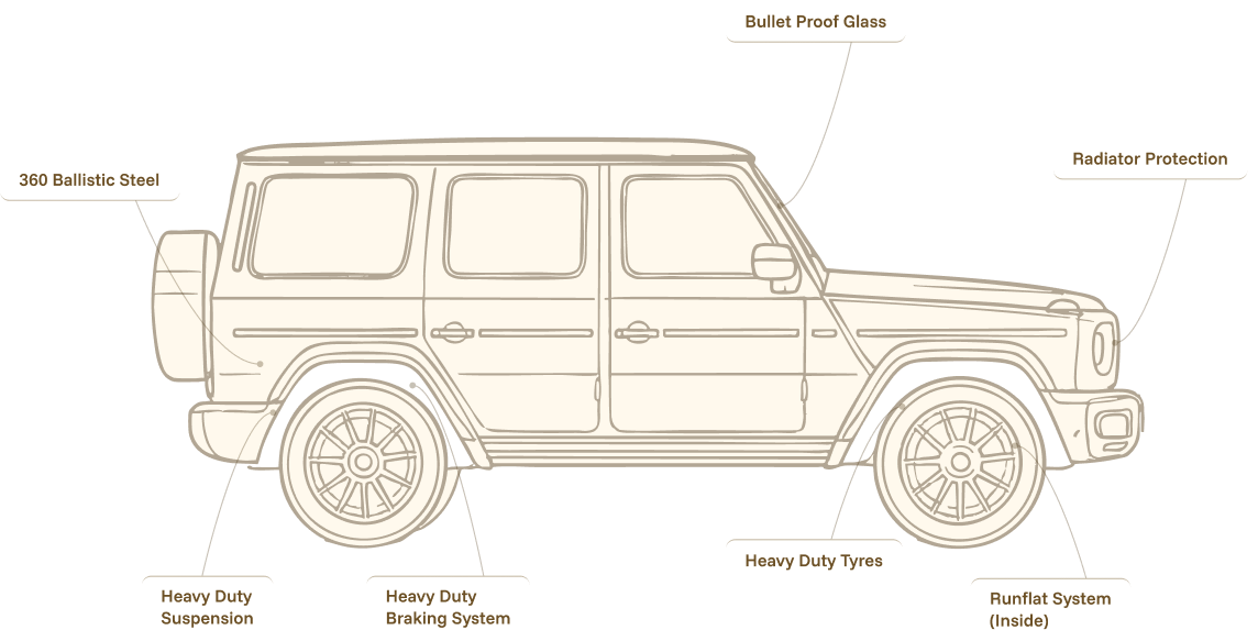 Every vehicle in our off-road range is built with precision-engineered protection systems, ensuring all-round safety in the harshest conditions. From ballistic steel to runflat tyres, each feature is integrated to withstand real-world threats.