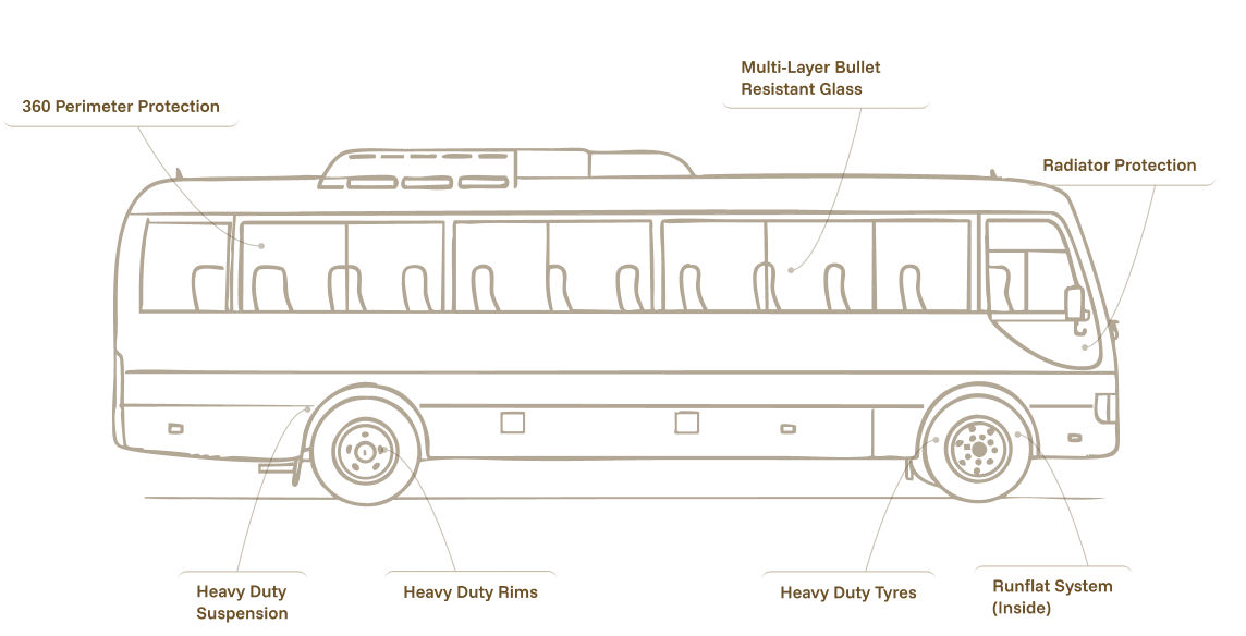 Each armoured bus is designed to transport passengers securely, combining spacious comfort with advanced protection systems. From reinforced armour plating to ballistic glass, every element is engineered to ensure safety against real-world threats during group travel.