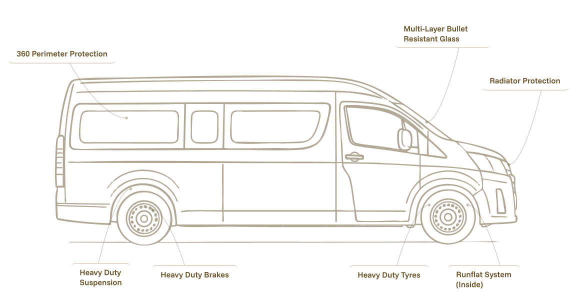 Engineered for versatility and protection, our armoured vans ensure the secure transport of personnel, goods, or sensitive cargo while maintaining reliability, comfort, and discretion in every journey.