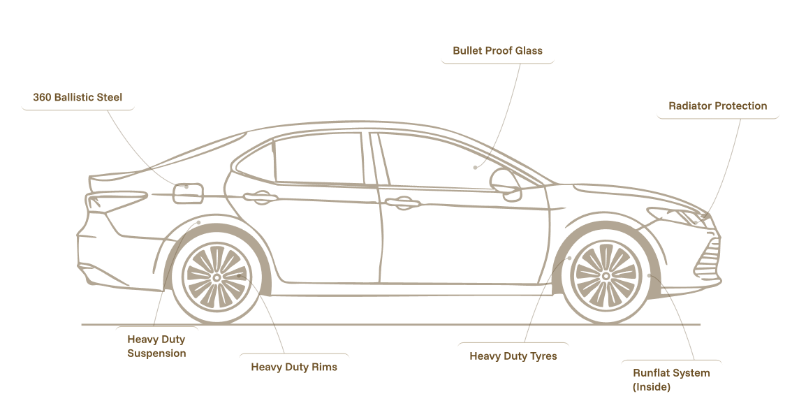 Every sedan in our range combines refined comfort with precision protection systems, ensuring uncompromising safety in urban and highway environments. From ballistic steel to runflat tyres, each feature is seamlessly integrated to safeguard against real-world threats.